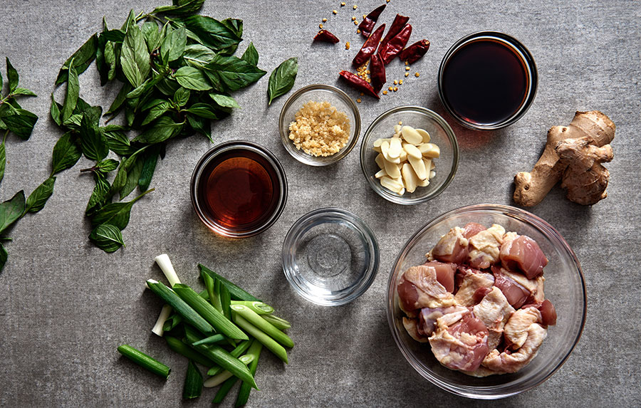 - Add sesame oil into the wok. Heat it up with medium high heat. Fragrant the sliced ginger, garlic and dry chilies in the hot oil. When you smell the ginger and garlic overwhelm your kitchen, you know the flavors have started to build. Add the chicken pieces into the wok. Lightly brown the chicken on both sides. Try to keep the skin in in tact while stirring throughout.